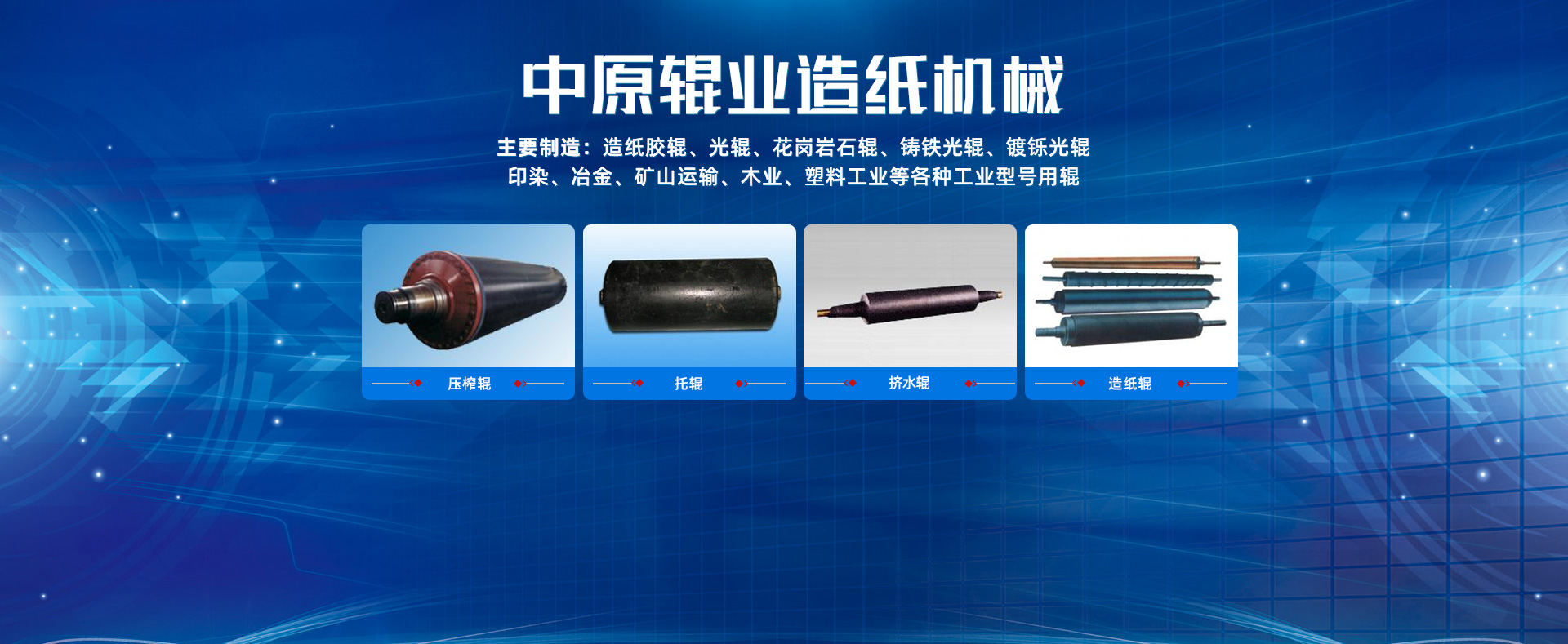 主要制造:造紙膠輥、光輥、花崗巖石輥、鑄鐵光輥、鍍鑠光輥、印染、冶金、礦山運輸、木業、塑料工業等各種工業型號用輥